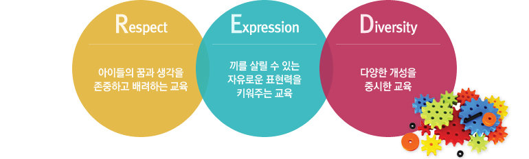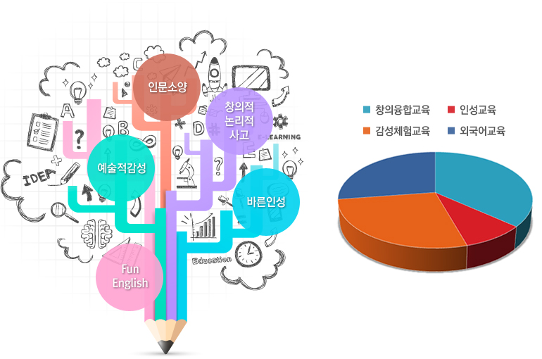 흥미로운 자기주도적인 놀이학습과 말하기 위주의 활동적인 외국어 수업을 통해 스스로 시도하고 탐구하여 언어 수 과학적 사고력을 기르며 영어로 우리말로 개성에 맞게 표현할 줄 아는 창의융합교육을 실천합니다. 개성 있는 꿈의 시작을 경험하는 교육 상상하는 것이 현실이 되는 교육